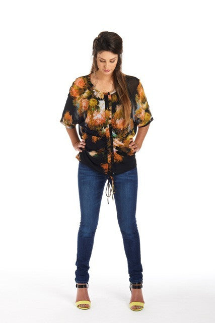 3/4 Sleeve Shirt with draw string detail front gather , front button with detail Stack Print Round neck 100% Polyester
