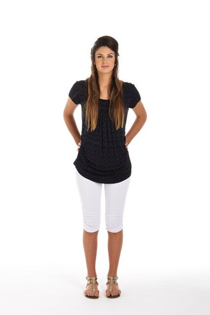 Black Aztec Pattern  top with short sleeve   round neck gather in front neat  handstich gathered sides  97 Viscose 3% Spandex